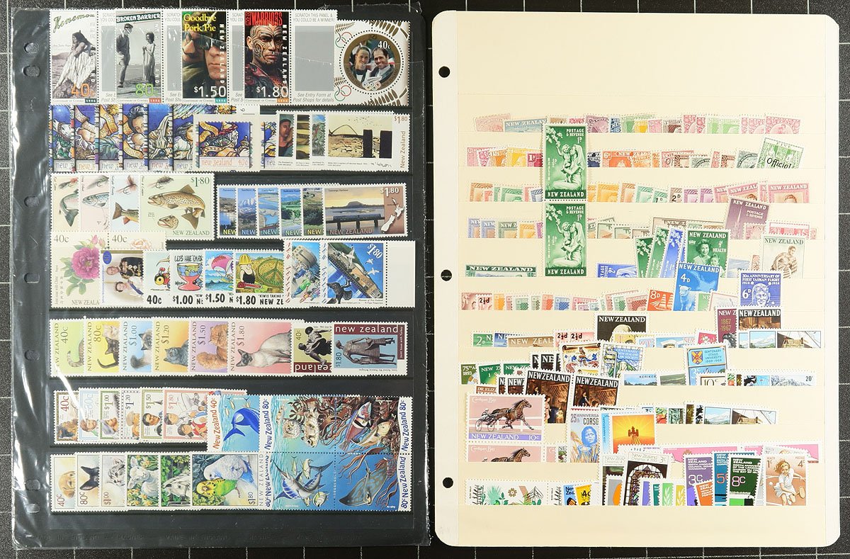 Nice collection / accumulation of primarily never hinged New Zealand, 1953-2003, containing roughly 725 stamps in roughly 15 stock pages. The lot generally ranges from Scott #288/1849, containing mostly sets, along with a few souvenir sheets, booklets, and semi-postal issues. A spot check indicated some material cataloguing $10 and up each, with the owner's 2018 Scott catalogue value for the lot totals US$1,093.00 ($1475.55 CDN), face value alone would be several hundreds dollars. A nice clean lot for collectors and dealers alike, with mild duplication throughout. Estimate =