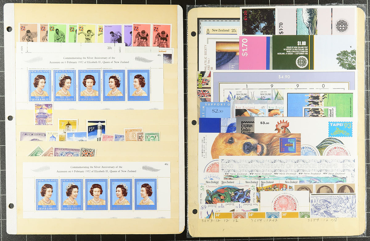 Nice collection / accumulation of primarily never hinged New Zealand, 1953-2003, containing roughly 725 stamps in roughly 15 stock pages. The lot generally ranges from Scott #288/1849, containing mostly sets, along with a few souvenir sheets, booklets, and semi-postal issues. A spot check indicated some material cataloguing $10 and up each, with the owner's 2018 Scott catalogue value for the lot totals US$1,093.00 ($1475.55 CDN), face value alone would be several hundreds dollars. A nice clean lot for collectors and dealers alike, with mild duplication throughout. Estimate =