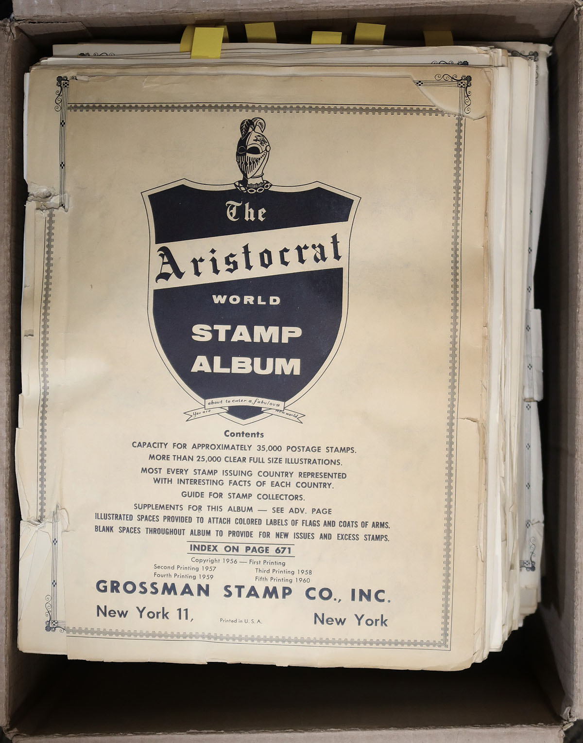 Very large old time collection of primarily used Worldwide stamps, 1880's-1960's, containing several thousands of stamps on several double sided Aristocrat album pages. The collection ranges from A to Z countries with a spot check indicating better representation from United States, Europe (noting France, Austria, Switzerland, and Eastern European regions in particular), Scandinavia, South America, and so much more. The collection also contains scattered mint throughout, along with souvenir sheets, stamps in glassines in pages, back of the book material, and more. Catalogue value tended to be $1 and under, but did spot a few better stamps, along with several postmark types including 'socked on the nose' town cancels. A nice lot for the worldwide collector and should be well worth our low estimate, probably a nickel or less a stamp, overall fine to very fine. Estimate =