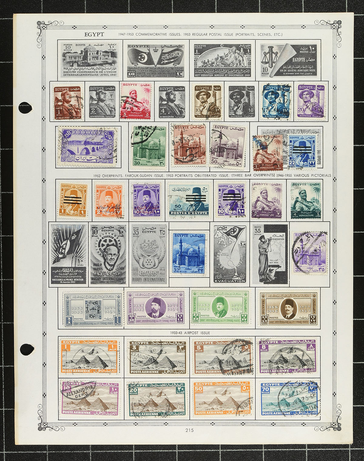 Very large old time collection of primarily used Worldwide stamps, 1880's-1960's, containing several thousands of stamps on several double sided Aristocrat album pages. The collection ranges from A to Z countries with a spot check indicating better representation from United States, Europe (noting France, Austria, Switzerland, and Eastern European regions in particular), Scandinavia, South America, and so much more. The collection also contains scattered mint throughout, along with souvenir sheets, stamps in glassines in pages, back of the book material, and more. Catalogue value tended to be $1 and under, but did spot a few better stamps, along with several postmark types including 'socked on the nose' town cancels. A nice lot for the worldwide collector and should be well worth our low estimate, probably a nickel or less a stamp, overall fine to very fine. Estimate =