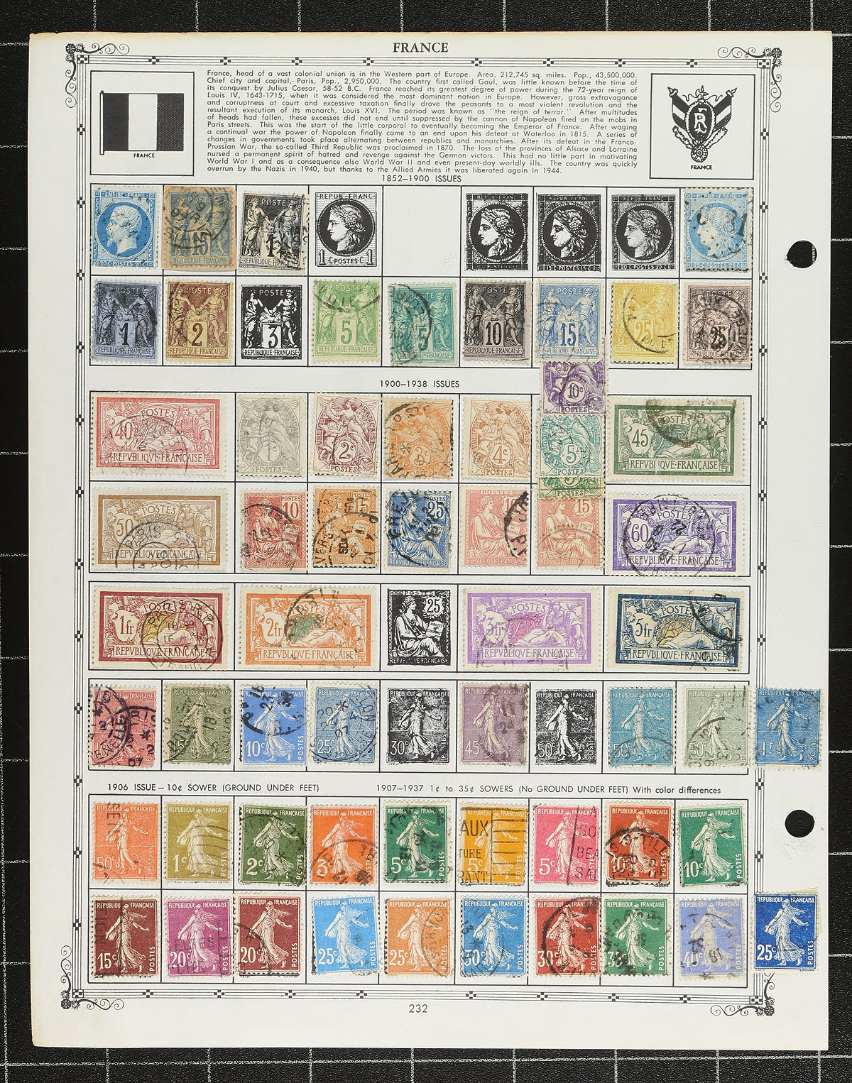 Very large old time collection of primarily used Worldwide stamps, 1880's-1960's, containing several thousands of stamps on several double sided Aristocrat album pages. The collection ranges from A to Z countries with a spot check indicating better representation from United States, Europe (noting France, Austria, Switzerland, and Eastern European regions in particular), Scandinavia, South America, and so much more. The collection also contains scattered mint throughout, along with souvenir sheets, stamps in glassines in pages, back of the book material, and more. Catalogue value tended to be $1 and under, but did spot a few better stamps, along with several postmark types including 'socked on the nose' town cancels. A nice lot for the worldwide collector and should be well worth our low estimate, probably a nickel or less a stamp, overall fine to very fine. Estimate =