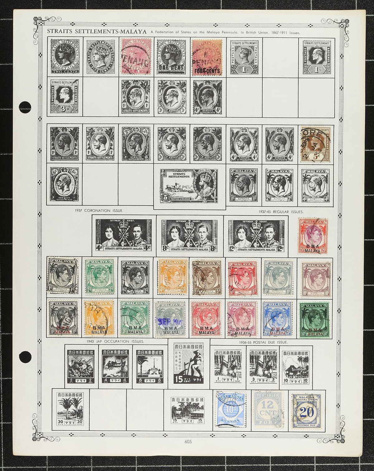 Very large old time collection of primarily used Worldwide stamps, 1880's-1960's, containing several thousands of stamps on several double sided Aristocrat album pages. The collection ranges from A to Z countries with a spot check indicating better representation from United States, Europe (noting France, Austria, Switzerland, and Eastern European regions in particular), Scandinavia, South America, and so much more. The collection also contains scattered mint throughout, along with souvenir sheets, stamps in glassines in pages, back of the book material, and more. Catalogue value tended to be $1 and under, but did spot a few better stamps, along with several postmark types including 'socked on the nose' town cancels. A nice lot for the worldwide collector and should be well worth our low estimate, probably a nickel or less a stamp, overall fine to very fine. Estimate =