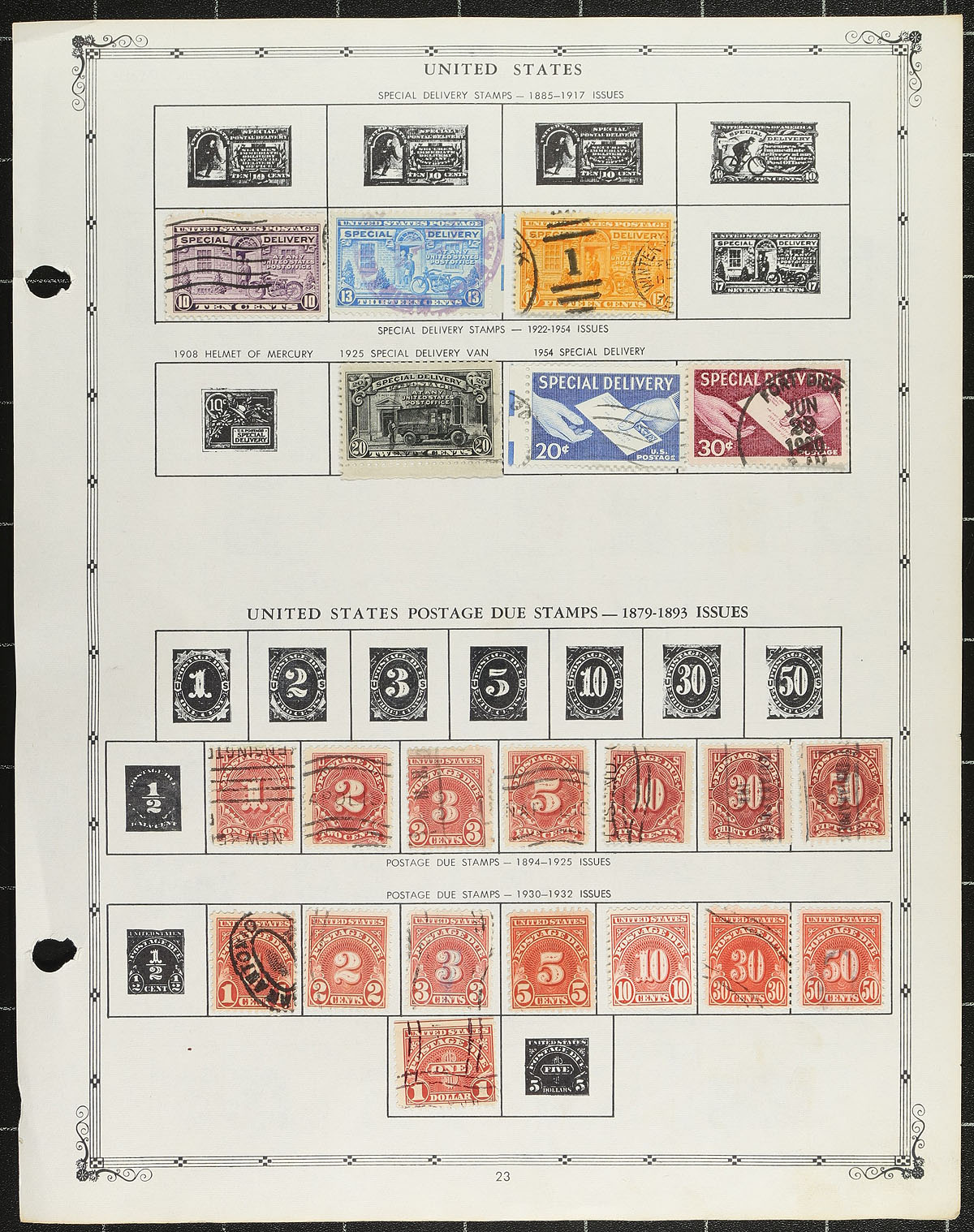 Very large old time collection of primarily used Worldwide stamps, 1880's-1960's, containing several thousands of stamps on several double sided Aristocrat album pages. The collection ranges from A to Z countries with a spot check indicating better representation from United States, Europe (noting France, Austria, Switzerland, and Eastern European regions in particular), Scandinavia, South America, and so much more. The collection also contains scattered mint throughout, along with souvenir sheets, stamps in glassines in pages, back of the book material, and more. Catalogue value tended to be $1 and under, but did spot a few better stamps, along with several postmark types including 'socked on the nose' town cancels. A nice lot for the worldwide collector and should be well worth our low estimate, probably a nickel or less a stamp, overall fine to very fine. Estimate =
