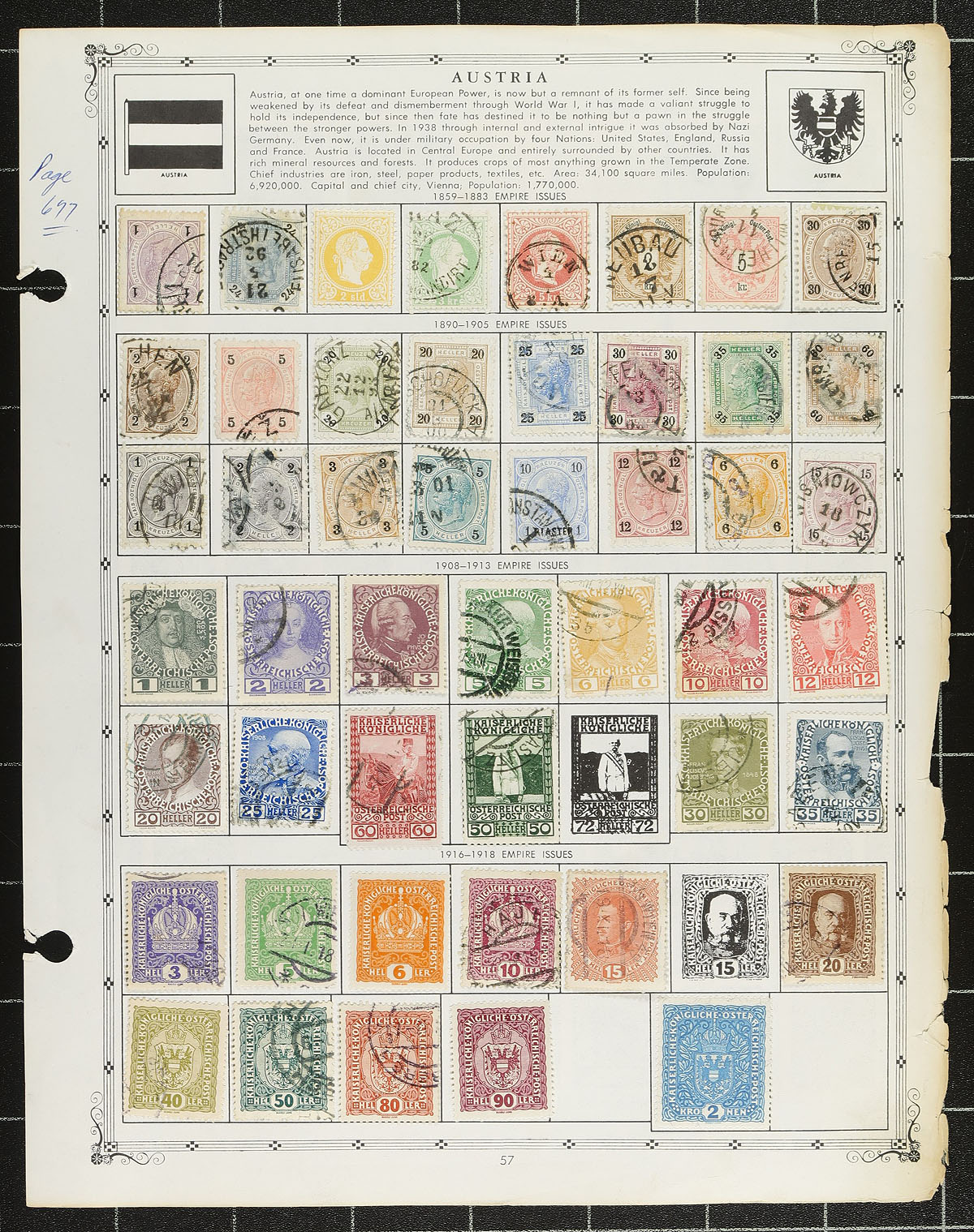 Very large old time collection of primarily used Worldwide stamps, 1880's-1960's, containing several thousands of stamps on several double sided Aristocrat album pages. The collection ranges from A to Z countries with a spot check indicating better representation from United States, Europe (noting France, Austria, Switzerland, and Eastern European regions in particular), Scandinavia, South America, and so much more. The collection also contains scattered mint throughout, along with souvenir sheets, stamps in glassines in pages, back of the book material, and more. Catalogue value tended to be $1 and under, but did spot a few better stamps, along with several postmark types including 'socked on the nose' town cancels. A nice lot for the worldwide collector and should be well worth our low estimate, probably a nickel or less a stamp, overall fine to very fine. Estimate =