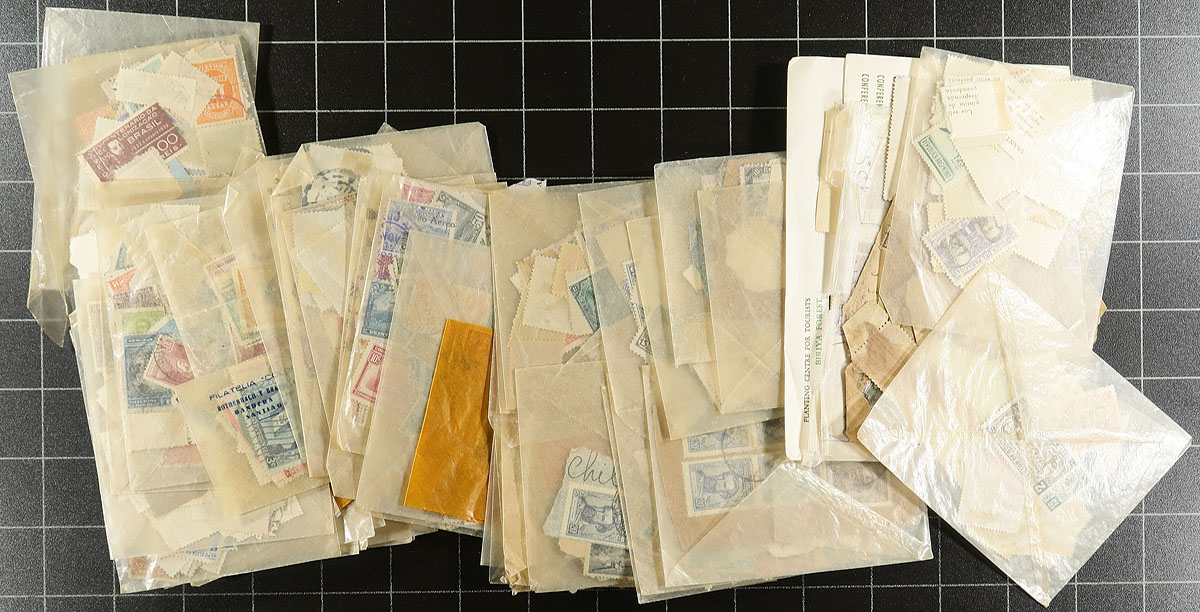 Carton full of thousands of worldwide stamps in a variety of formats, including worldwide albums, stockbooks, album and stock pages, in envelopes, glassines, and more. A cursory check indicated material from the 1890's to the 1970's, but this is a lot for the dedicated collector to make the finds. Still, surprisingly fairly organized for the contents, overall fine to very fine. Estimate =