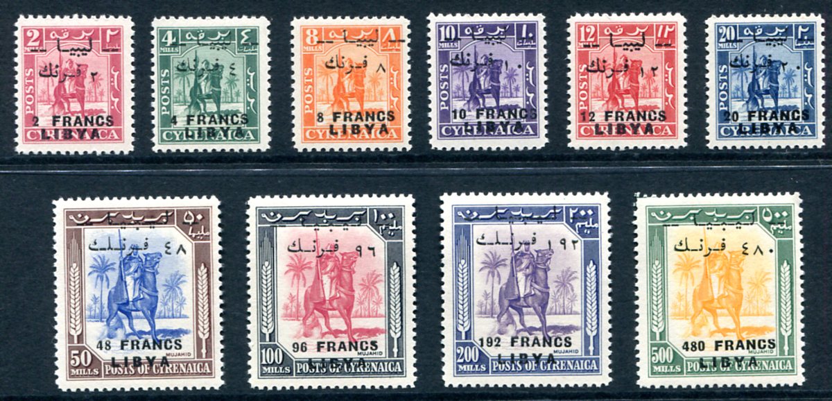 Complete mint Very Lightly Hinged set of the 1951 Libya overprints/surcharges on stamp of Cyrenaica for use in Fezzan. A lovely set, with Post Office fresh colour and near pristine gum. 2025 Scott US$434.55 =