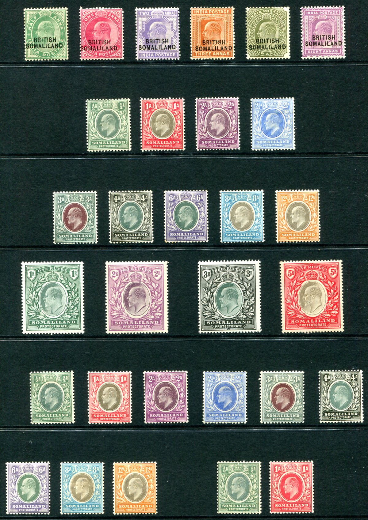 Stunning complete mint Hinged run (all in complete sets) of all the Edward VII issues from this East African nation. Issued between 1903-1909, with the first set being overprints on stamps of India, before transitioning to stamps printed specifically for the colony. A lovely group. 2025 Scott US$428.50 =