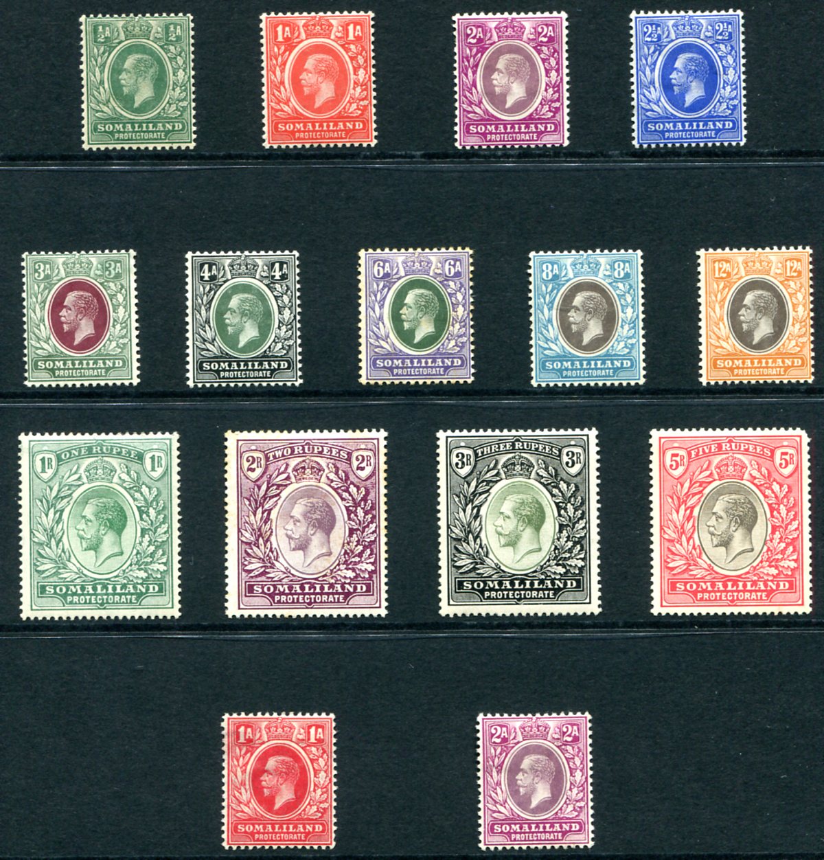 Complete mint Hinged (generally Lightly) set of the 1912-1919 George V series of 13 values, plus the two sub-listed shade varieties (#52a, 53a). A striking set, the first George V series from this colony. 2025 Scott US$292.90 =