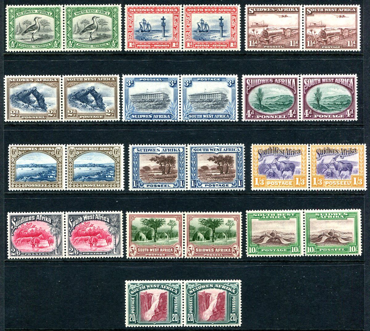Complete mint Lightly Hinged set of the 1931-1937 Pictorial series of 13 different values, in pairs with both English and Afrikaans language. A lovely set, with Post Office fresh colour. 2025 Scott US$228.60 =