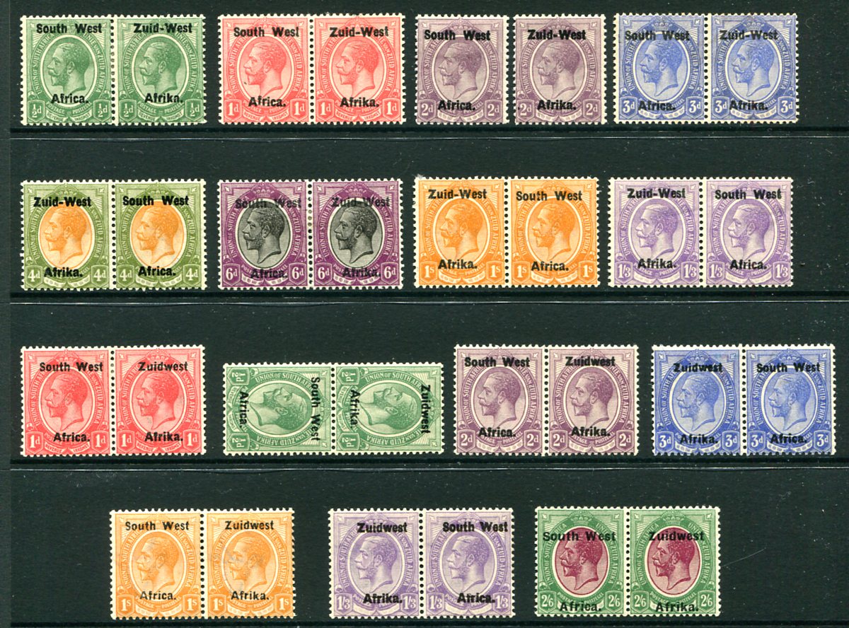 Mint Lightly Hinged assembly of 1923 George V pairs in both English and Afrikaans language, with 8 pairs from Setting I (1/2d to 1sh3d complete, 2d is in singles), and 7 pairs from Setting III (1/2d to 2sh6d complete). Owner's 2022 Scott US$244.75 =