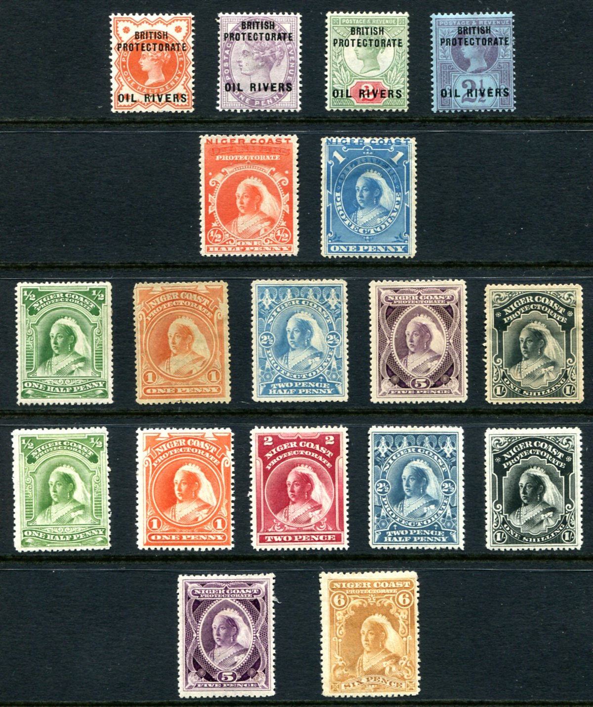 Attractive mint Hinged group of 18 different 1892-1898 Queen Victoria issues, including the first four values of the first series overprinted "British Protectorate, Oil Rivers" on stamps of Great Britain. All neatly arranged on a stockpage. 2025 Scott US$301.25 =