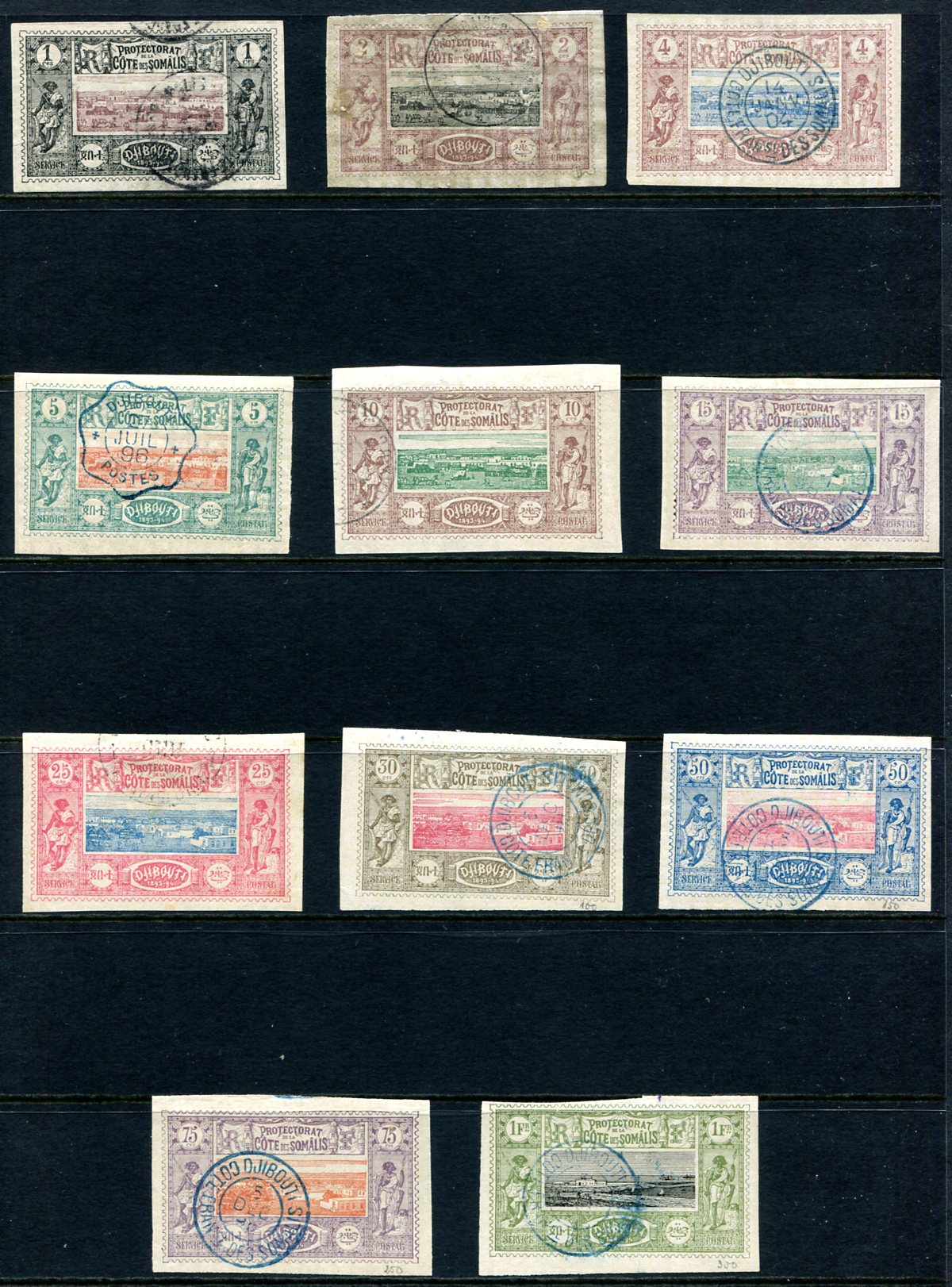 Selection of 11 different used examples of the 1894-1902 issued "simulated perforation" imperforates from the "View of Djibouti" series. Generally F/VF, mostly 4-margin examples with "socked on the nose" postmarks. 2025 Scott US$139.25 =