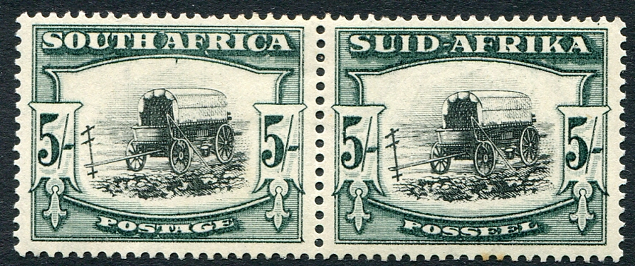 VF mint Lightly Hinged example of the 1927 issued 5sh deep green & black "Ox Wagon" high value se-tenant. The key value of the set. 2026 Scott US$300.00 =