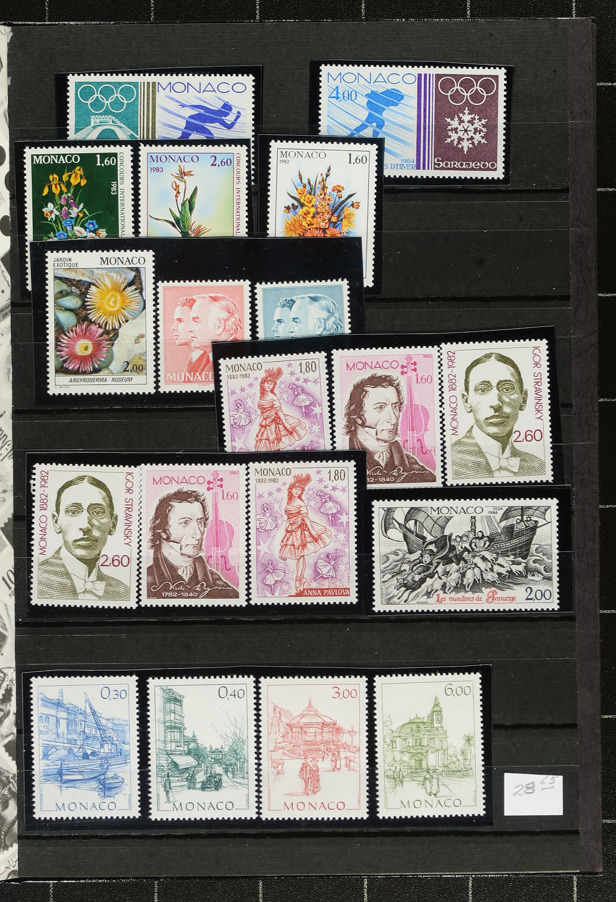 Lovely group of mint Monaco, 1958-1987, containing roughly 250 stamps neatly organized in a small stockbook and a few stock pages. The lot generally ranges from Scott #412/1578, including several sets, a few souvenir sheets, and semi-postals, noting some sets and souvenir sheets in the $8 to $20 range, with some material identified with current catalogue pricing. A spot check indicates a mixture of hinged and never hinged material. Clean and well organized for collectors and dealers alike, with all pages photographed online. 2026 Scott US$559.00 =