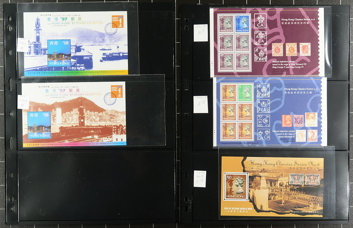 Lovely collection / accumulation of never hinged Hong Kong souvenir sheets, 1974-2000, containing 94 sheets (also a few mint sets), in 17 double sided stock pages housed in a binder. This well organized collection ranges from Scott #298a/889b, with all the sheets identified and catalogued using current Scott values, noting just a few of the better items with #s 298a (c.v. $60), 308a ($110), 464a (x4, $112 total), along with a few sheets cataloguing $20 and up. A terrific lot for collectors and dealers alike. Post office fresh and very fine, with all pages photographed online. 2026 Scott US$1,506.00 =