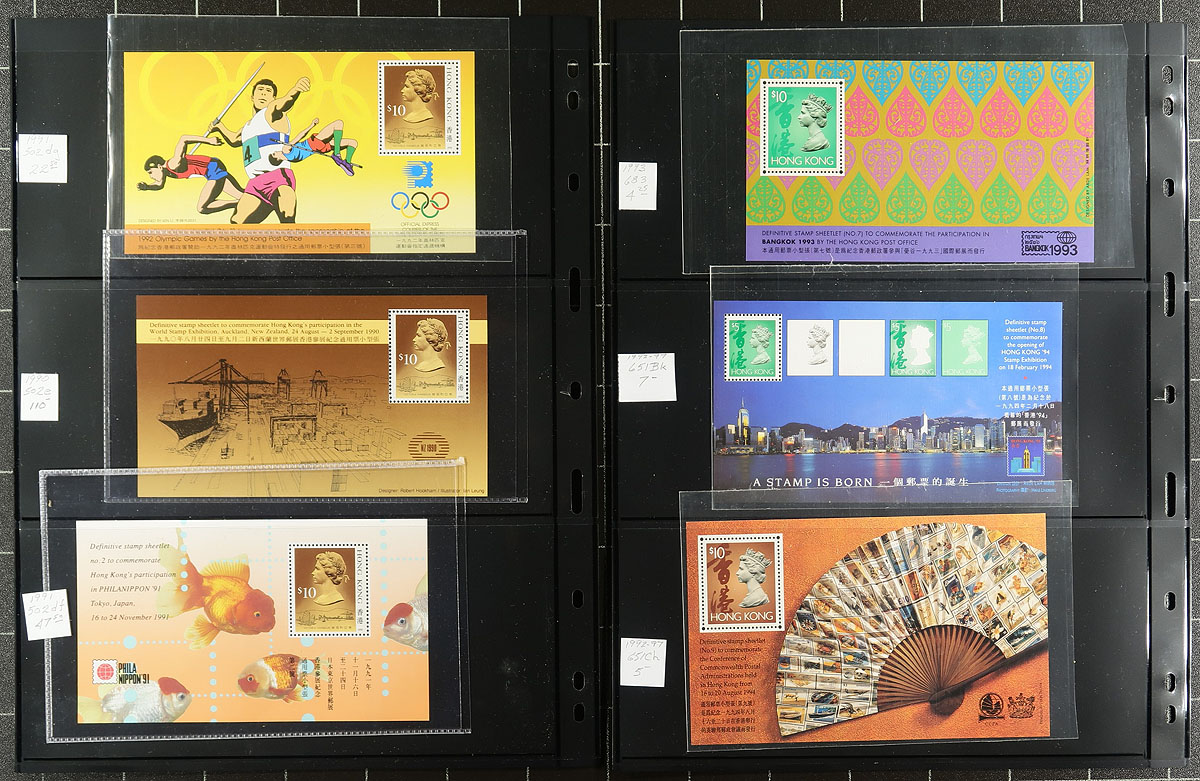 Lovely collection / accumulation of never hinged Hong Kong souvenir sheets, 1974-2000, containing 94 sheets (also a few mint sets), in 17 double sided stock pages housed in a binder. This well organized collection ranges from Scott #298a/889b, with all the sheets identified and catalogued using current Scott values, noting just a few of the better items with #s 298a (c.v. $60), 308a ($110), 464a (x4, $112 total), along with a few sheets cataloguing $20 and up. A terrific lot for collectors and dealers alike. Post office fresh and very fine, with all pages photographed online. 2026 Scott US$1,506.00 =