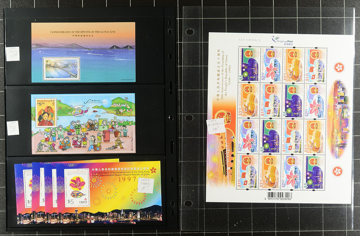 Lovely collection / accumulation of never hinged Hong Kong souvenir sheets, 1974-2000, containing 94 sheets (also a few mint sets), in 17 double sided stock pages housed in a binder. This well organized collection ranges from Scott #298a/889b, with all the sheets identified and catalogued using current Scott values, noting just a few of the better items with #s 298a (c.v. $60), 308a ($110), 464a (x4, $112 total), along with a few sheets cataloguing $20 and up. A terrific lot for collectors and dealers alike. Post office fresh and very fine, with all pages photographed online. 2026 Scott US$1,506.00 =