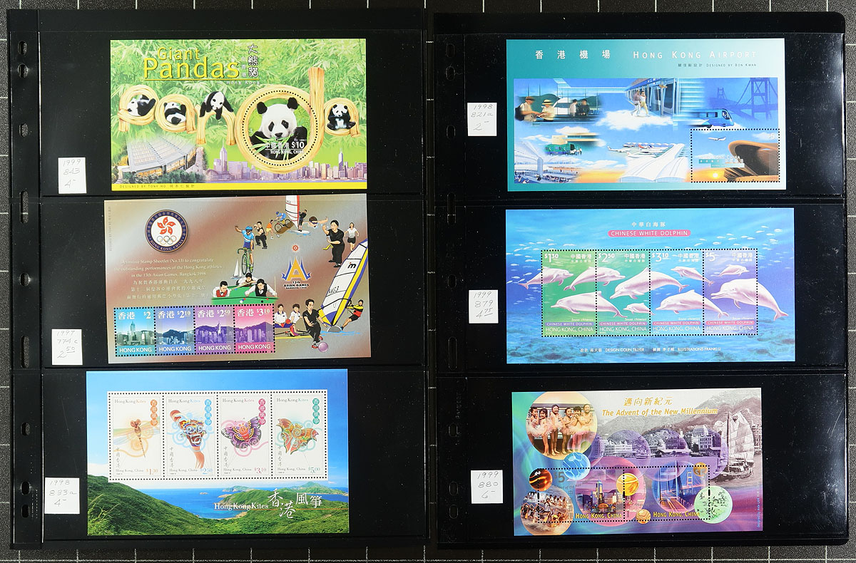 Lovely collection / accumulation of never hinged Hong Kong souvenir sheets, 1974-2000, containing 94 sheets (also a few mint sets), in 17 double sided stock pages housed in a binder. This well organized collection ranges from Scott #298a/889b, with all the sheets identified and catalogued using current Scott values, noting just a few of the better items with #s 298a (c.v. $60), 308a ($110), 464a (x4, $112 total), along with a few sheets cataloguing $20 and up. A terrific lot for collectors and dealers alike. Post office fresh and very fine, with all pages photographed online. 2026 Scott US$1,506.00 =