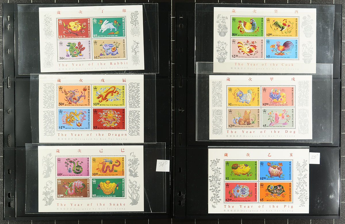 Lovely collection / accumulation of never hinged Hong Kong souvenir sheets, 1974-2000, containing 94 sheets (also a few mint sets), in 17 double sided stock pages housed in a binder. This well organized collection ranges from Scott #298a/889b, with all the sheets identified and catalogued using current Scott values, noting just a few of the better items with #s 298a (c.v. $60), 308a ($110), 464a (x4, $112 total), along with a few sheets cataloguing $20 and up. A terrific lot for collectors and dealers alike. Post office fresh and very fine, with all pages photographed online. 2026 Scott US$1,506.00 =