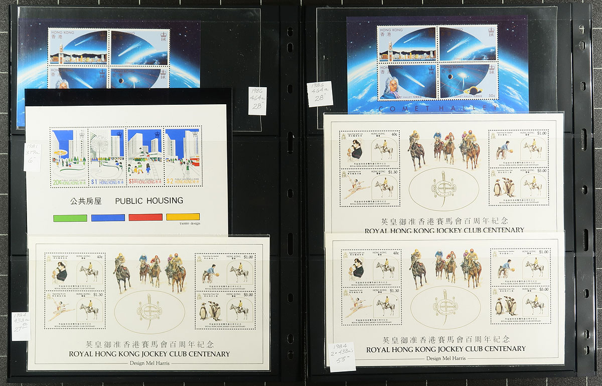 Lovely collection / accumulation of never hinged Hong Kong souvenir sheets, 1974-2000, containing 94 sheets (also a few mint sets), in 17 double sided stock pages housed in a binder. This well organized collection ranges from Scott #298a/889b, with all the sheets identified and catalogued using current Scott values, noting just a few of the better items with #s 298a (c.v. $60), 308a ($110), 464a (x4, $112 total), along with a few sheets cataloguing $20 and up. A terrific lot for collectors and dealers alike. Post office fresh and very fine, with all pages photographed online. 2026 Scott US$1,506.00 =
