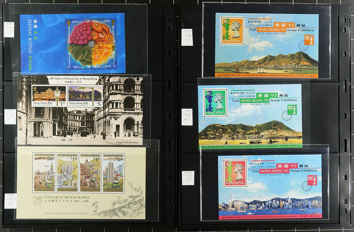 Lovely collection / accumulation of never hinged Hong Kong souvenir sheets, 1974-2000, containing 94 sheets (also a few mint sets), in 17 double sided stock pages housed in a binder. This well organized collection ranges from Scott #298a/889b, with all the sheets identified and catalogued using current Scott values, noting just a few of the better items with #s 298a (c.v. $60), 308a ($110), 464a (x4, $112 total), along with a few sheets cataloguing $20 and up. A terrific lot for collectors and dealers alike. Post office fresh and very fine, with all pages photographed online. 2026 Scott US$1,506.00 =