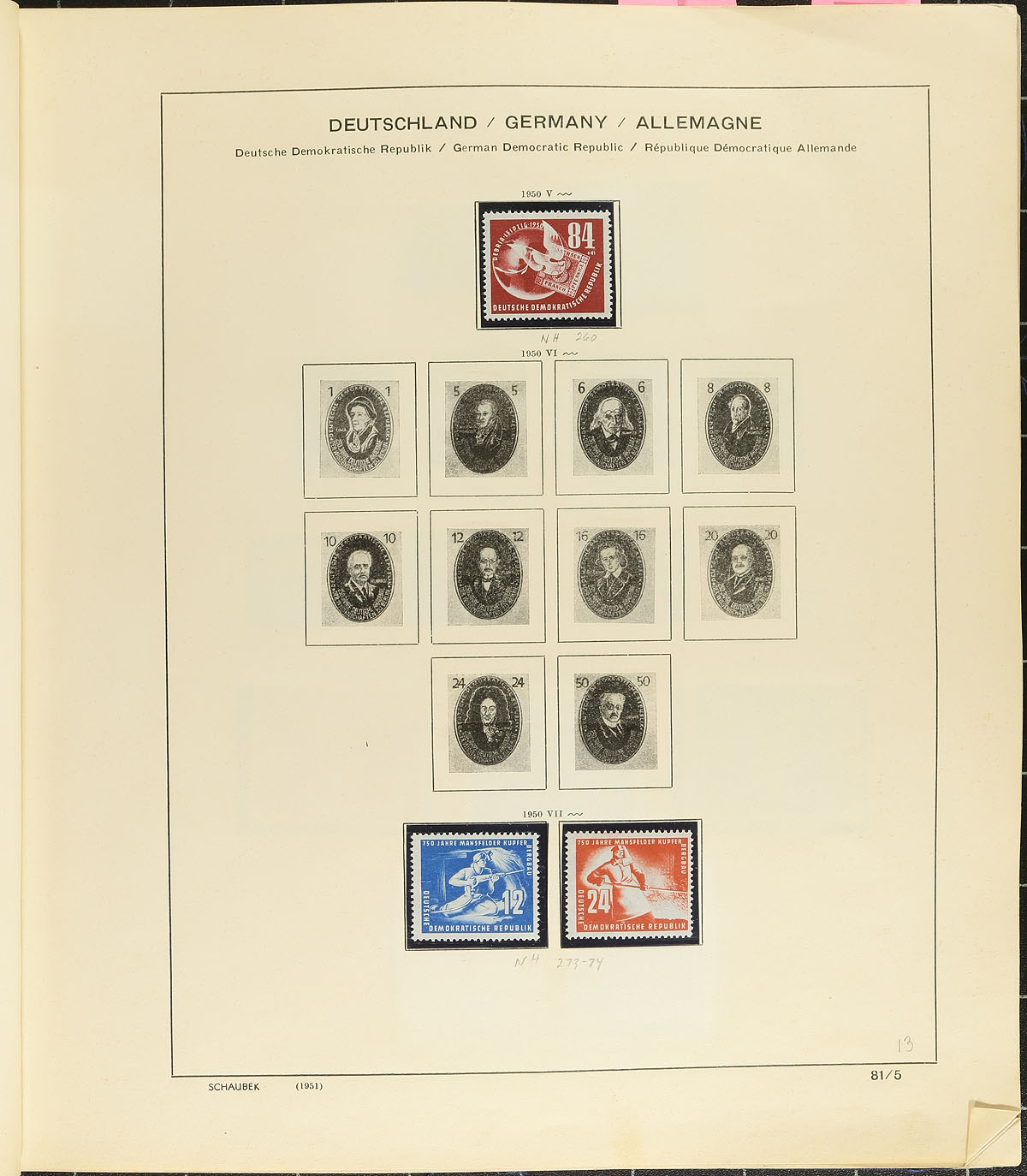 Collection of primarily mint German Democratic Republic, 1949-1970, containing roughly 500 stamps in an old time Schaubek album (front cover missing the binding). The collection generally ranges from Scott #48/1250, noting several sets, along with a few semi-postals and souvenir sheets. A spot check indicated a few items cataloguing $10 and up including #54-57a (mh, $75 total), 264a (nh, $60). Most of the mint material are in hingeless mounts, with used material hinged onto album pages. A nice starter collection, overall fine to very fine. Estimate =