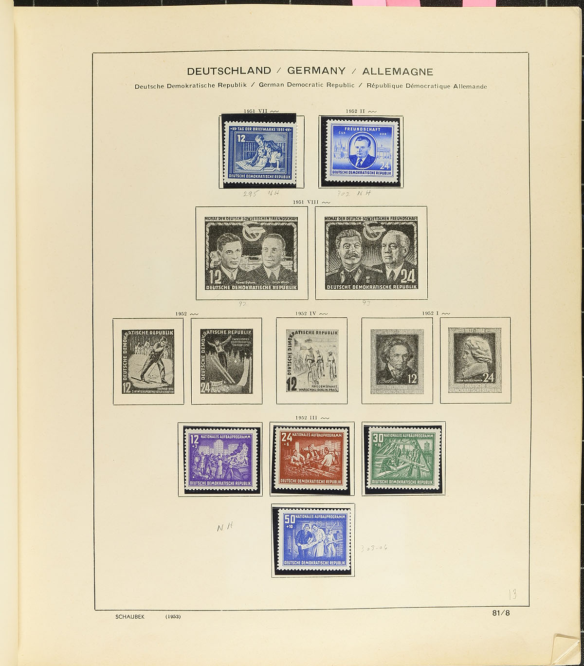 Collection of primarily mint German Democratic Republic, 1949-1970, containing roughly 500 stamps in an old time Schaubek album (front cover missing the binding). The collection generally ranges from Scott #48/1250, noting several sets, along with a few semi-postals and souvenir sheets. A spot check indicated a few items cataloguing $10 and up including #54-57a (mh, $75 total), 264a (nh, $60). Most of the mint material are in hingeless mounts, with used material hinged onto album pages. A nice starter collection, overall fine to very fine. Estimate =