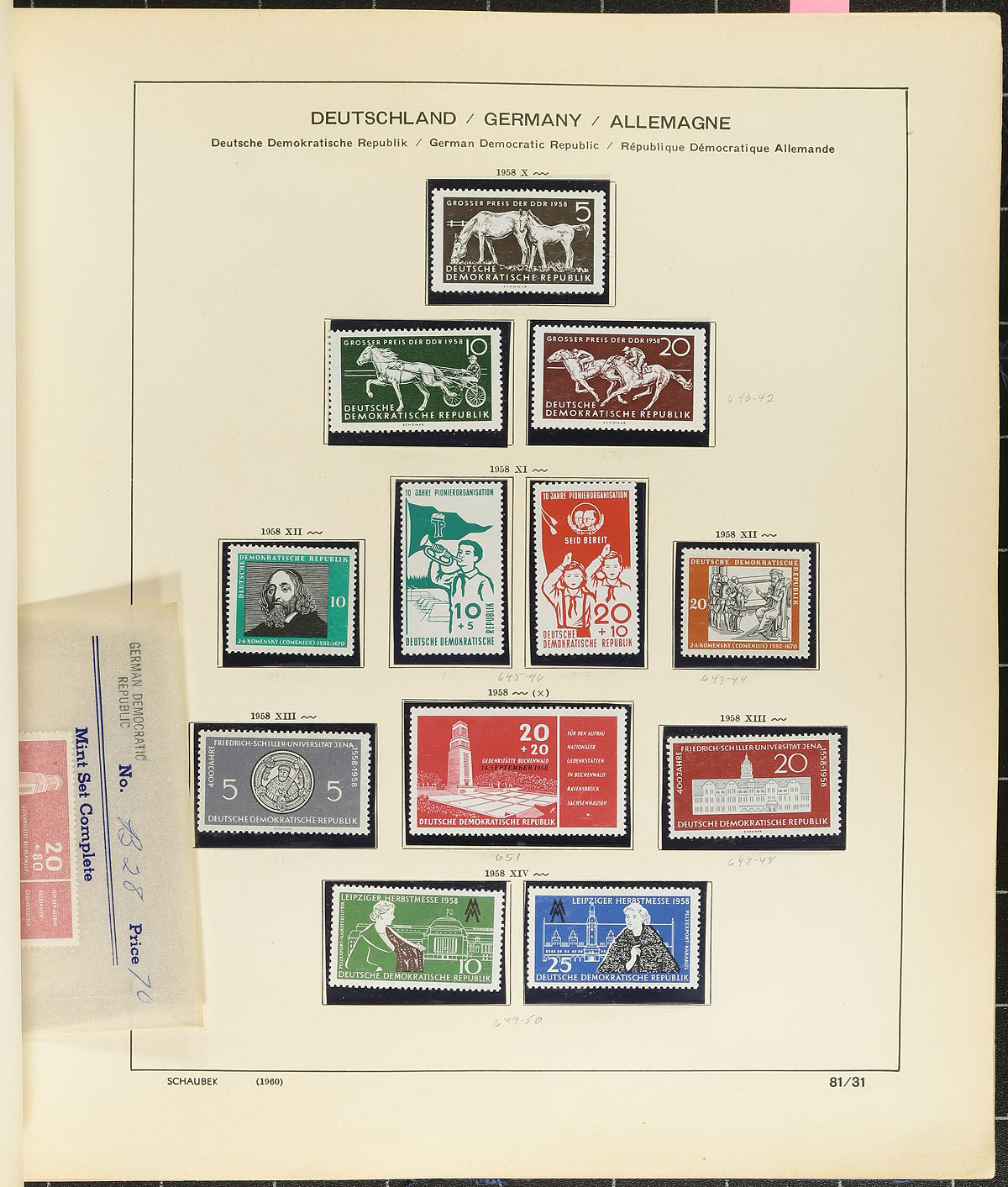 Collection of primarily mint German Democratic Republic, 1949-1970, containing roughly 500 stamps in an old time Schaubek album (front cover missing the binding). The collection generally ranges from Scott #48/1250, noting several sets, along with a few semi-postals and souvenir sheets. A spot check indicated a few items cataloguing $10 and up including #54-57a (mh, $75 total), 264a (nh, $60). Most of the mint material are in hingeless mounts, with used material hinged onto album pages. A nice starter collection, overall fine to very fine. Estimate =