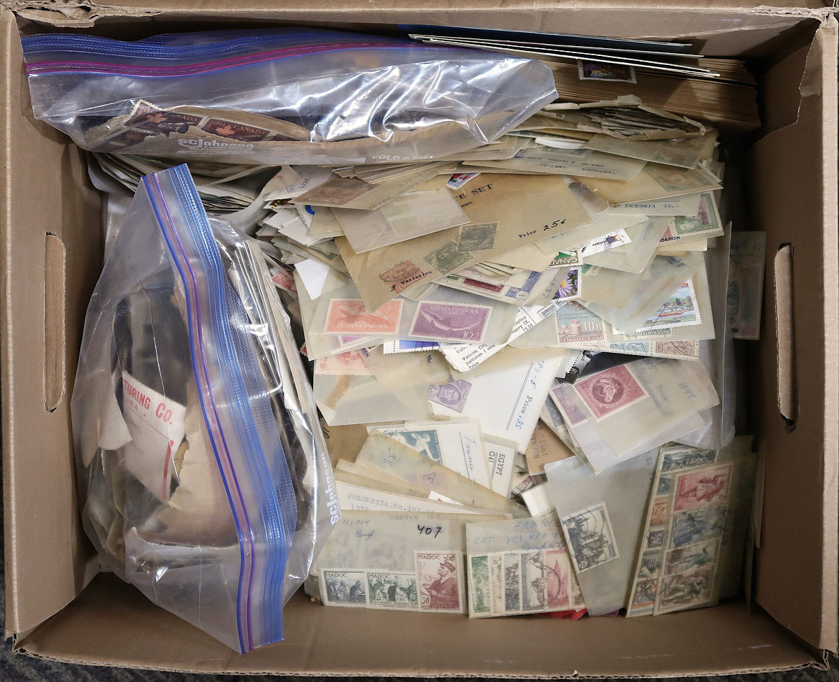 Diverse lot of worldwide mint and used material in a bankers box, containing a few thousand stamps on album or stock pages, glassines, etc. A spot check revealed some interesting material including several old time "approval" packets, appearing to have sets and short sets from the 1950s-1960s, mint and used souvenir sheets, German reprints, Christmas seals, and much more. We note better representation from Europe and British Commonwealth countries, generally ranging from the 1920's to the 1980's, noting some material cataloguing in the $5 to $10 range. A nice lot with potential finds for the dedicated collector. Estimate =