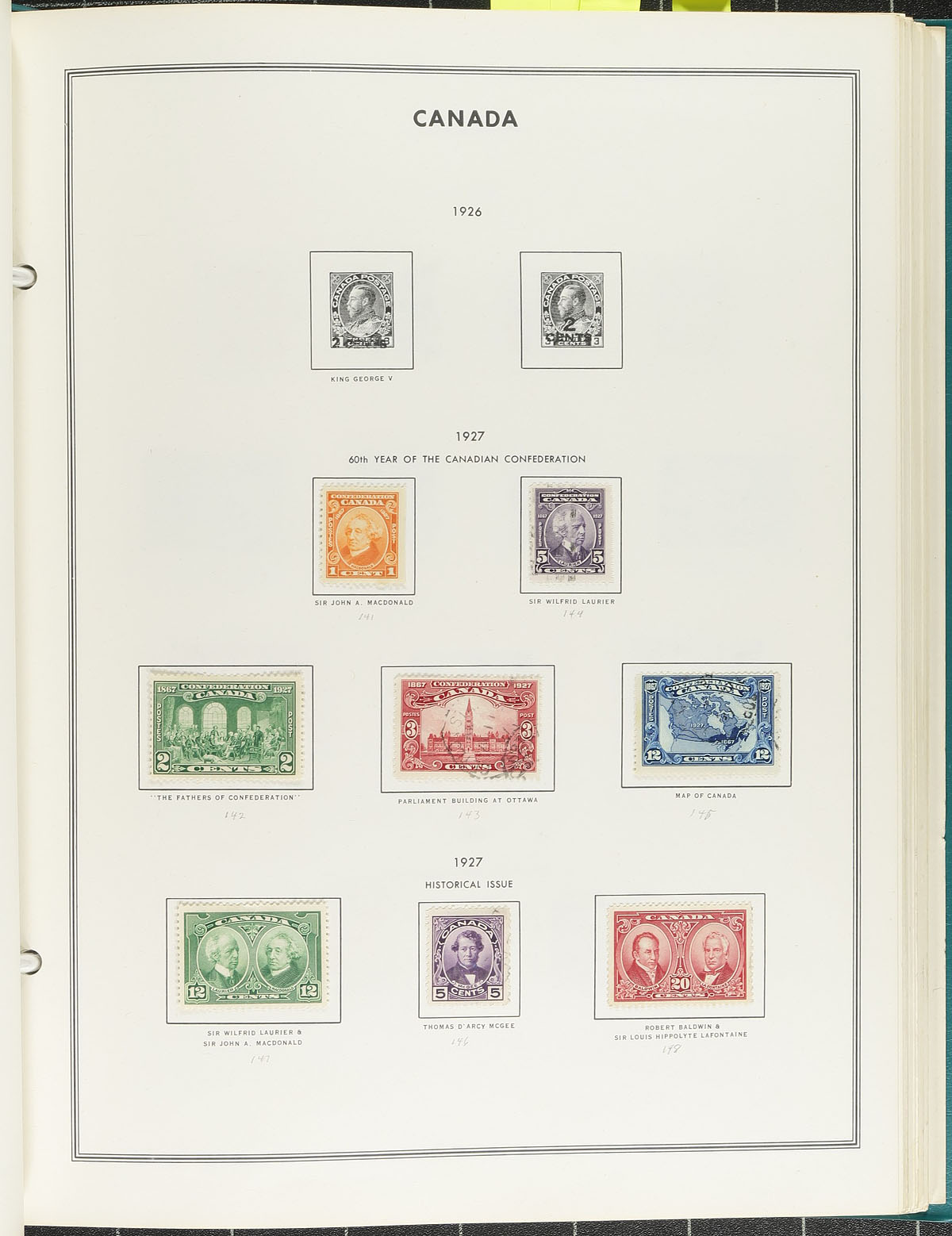 Starter collection of used Canada, 1870's-1970's, containing a few hundred stamps neatly organized in a Harris album. The collection ranges from Scott #18/561, including a few coils, back of the book issues, and a small group of Newfoundland stamps. The lot essentially begins with a few Small Queens, and partial sets of Leafs, Numerals, Edwards, Quebecs (up to the 7c), Scrolls (noting $1 Parliament), along with a few complete sets of Admirals and 1935 Pictorials. The lot also includes a few mint stamps scattered within. A nice starter lot with a few better values, overall fine to very fine. Estimate =