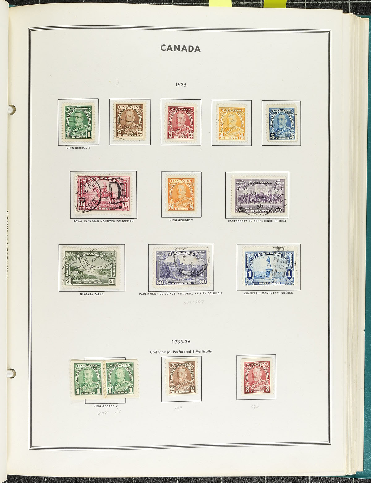 Starter collection of used Canada, 1870's-1970's, containing a few hundred stamps neatly organized in a Harris album. The collection ranges from Scott #18/561, including a few coils, back of the book issues, and a small group of Newfoundland stamps. The lot essentially begins with a few Small Queens, and partial sets of Leafs, Numerals, Edwards, Quebecs (up to the 7c), Scrolls (noting $1 Parliament), along with a few complete sets of Admirals and 1935 Pictorials. The lot also includes a few mint stamps scattered within. A nice starter lot with a few better values, overall fine to very fine. Estimate =
