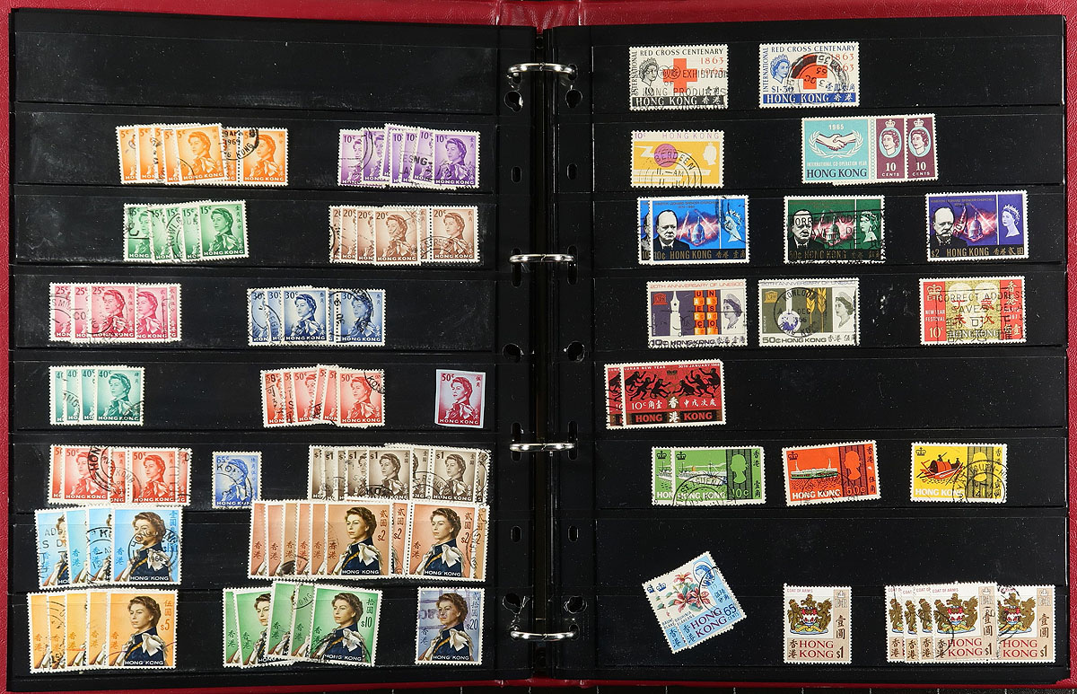 A collector's mostly used duplicates of Hong Kong, from Queen Victoria up to 2022, all neatly arranged on 9 Vario stockpages (double sided) within a deluxe padded Stanley Gibbons padded 3-ring binder. Several hundred stamps in total, plus a couple mint souvenir sheets and stamp show souvenir items (1987/1994). Noted some better values in the earlier stamps, a QV perfin, "CHINA" overprints and some attractive postmarks. A fun group to sort out. Estimate =