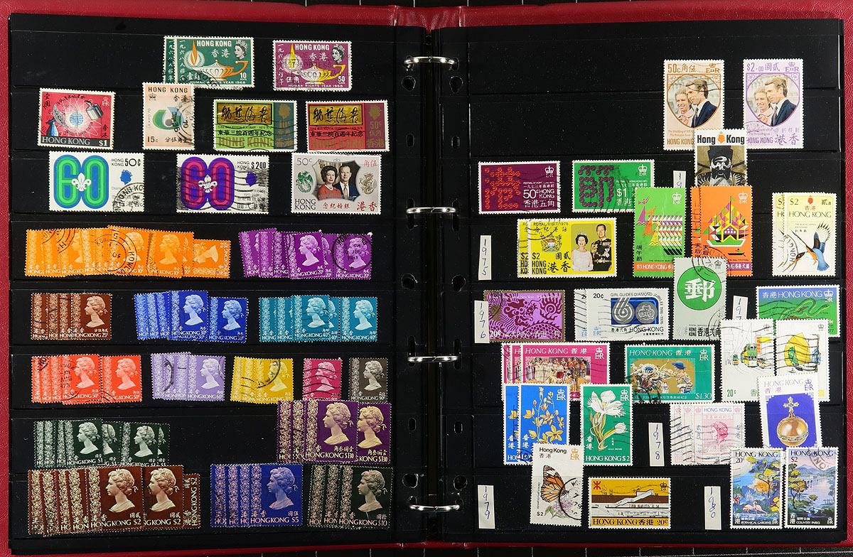 A collector's mostly used duplicates of Hong Kong, from Queen Victoria up to 2022, all neatly arranged on 9 Vario stockpages (double sided) within a deluxe padded Stanley Gibbons padded 3-ring binder. Several hundred stamps in total, plus a couple mint souvenir sheets and stamp show souvenir items (1987/1994). Noted some better values in the earlier stamps, a QV perfin, "CHINA" overprints and some attractive postmarks. A fun group to sort out. Estimate =