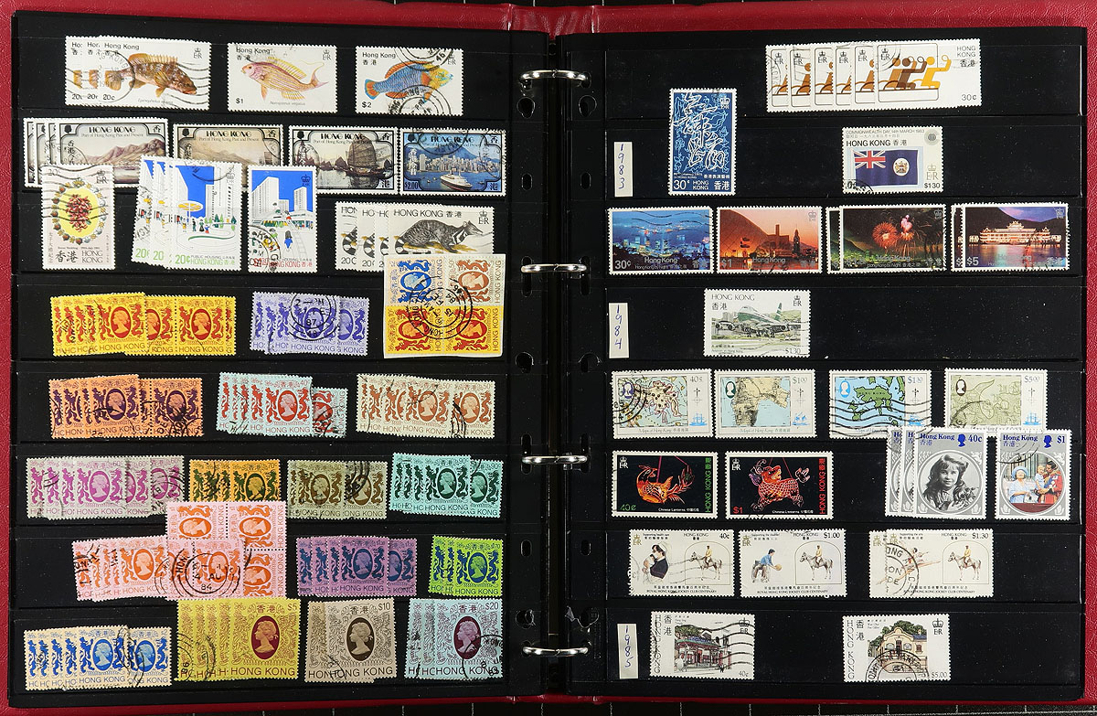 A collector's mostly used duplicates of Hong Kong, from Queen Victoria up to 2022, all neatly arranged on 9 Vario stockpages (double sided) within a deluxe padded Stanley Gibbons padded 3-ring binder. Several hundred stamps in total, plus a couple mint souvenir sheets and stamp show souvenir items (1987/1994). Noted some better values in the earlier stamps, a QV perfin, "CHINA" overprints and some attractive postmarks. A fun group to sort out. Estimate =