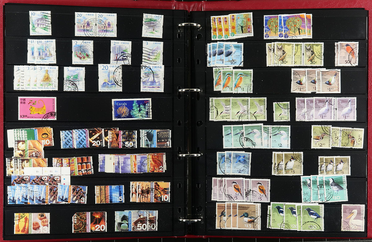 A collector's mostly used duplicates of Hong Kong, from Queen Victoria up to 2022, all neatly arranged on 9 Vario stockpages (double sided) within a deluxe padded Stanley Gibbons padded 3-ring binder. Several hundred stamps in total, plus a couple mint souvenir sheets and stamp show souvenir items (1987/1994). Noted some better values in the earlier stamps, a QV perfin, "CHINA" overprints and some attractive postmarks. A fun group to sort out. Estimate =