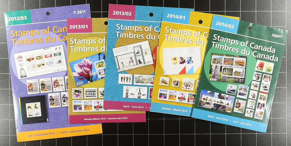 Quarterly Packs. A clean offering of 5 different P.O. issued Quarterly Packs, from 2012 (Q3), 2013 (Q1/Q2) and 2014 (Q1/Q2). Includes many sought-after die cut singles as well as blocks and souvenir sheets. These are now listed in Unitrade but not yet priced, conservatively grouped / counted by the original purchase price, which is lower than what is actually enclosed in the pack due to the increase in value of the Permanent stamps. Original Canada Post cost =