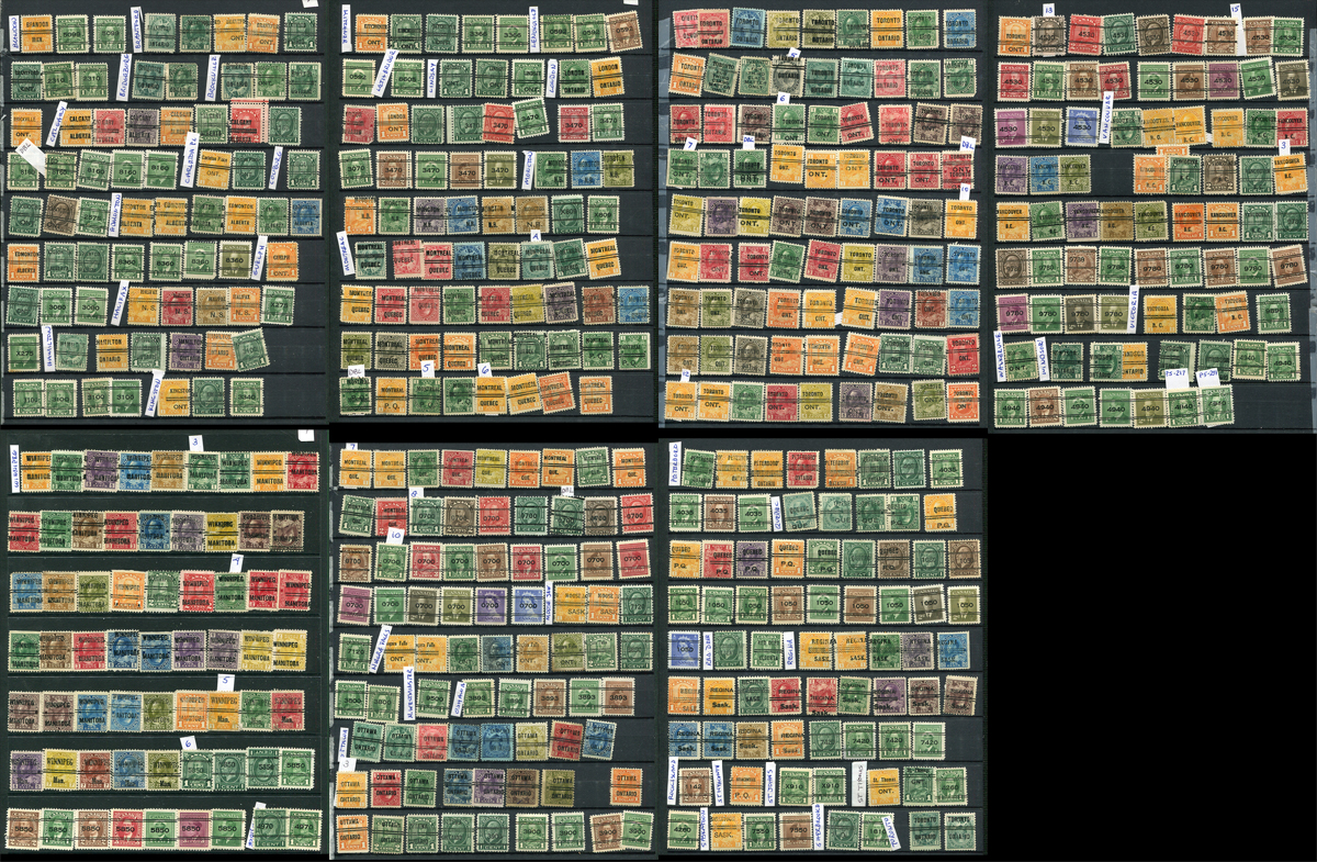 A collector's selection of 518 different stamps, from 41 Cities and Towns, all identified by Town/City and sorted by style on 7 stockpages. The owner notes that 1/3 of these stamps value at $2.50 or more, and of these there are 55 which value in the $10.00-$40.00 range. Also noted are 5 doubles and 2 perfins in the mix. Overall, a higher quality offering than usually seen. If you want to start collecting Precancels, this is the lot for you. Owner's Standard Precancel Catalogue =