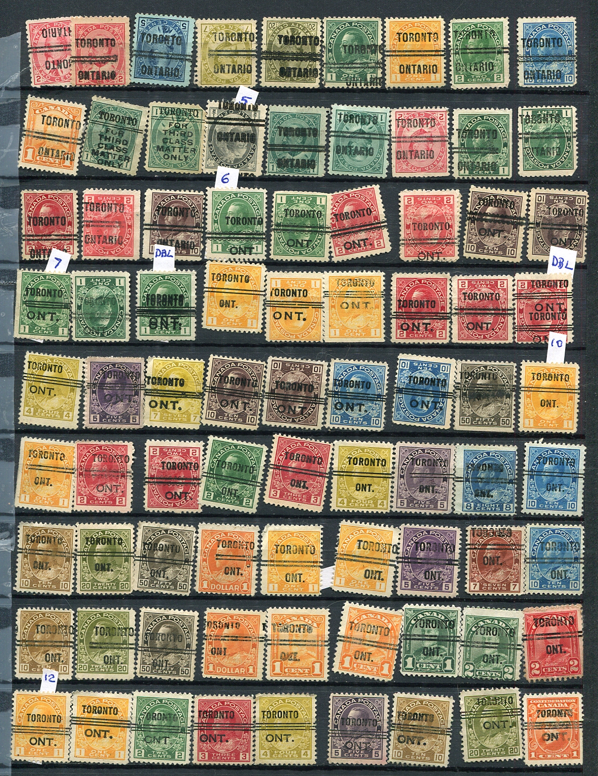 A collector's selection of 518 different stamps, from 41 Cities and Towns, all identified by Town/City and sorted by style on 7 stockpages. The owner notes that 1/3 of these stamps value at $2.50 or more, and of these there are 55 which value in the $10.00-$40.00 range. Also noted are 5 doubles and 2 perfins in the mix. Overall, a higher quality offering than usually seen. If you want to start collecting Precancels, this is the lot for you. Owner's Standard Precancel Catalogue =