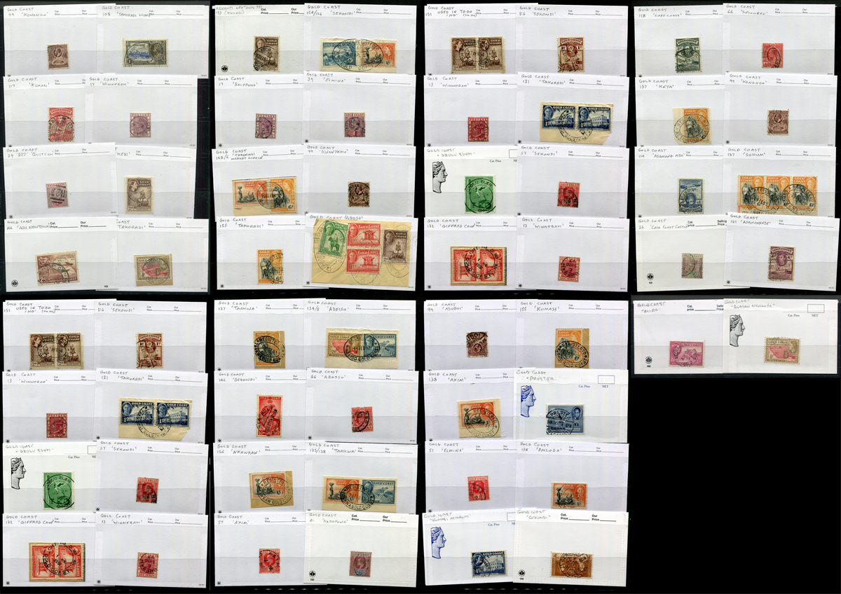 An enticing and seldom offered selection of 58 postmarks on stamp / stamp and piece, from the Queen Victoria to early QEII period, all neatly arranged / identified on "102" cards and placed on Vario stockpages. Some striking postmarks here, including both town and numeral types. Estimate =