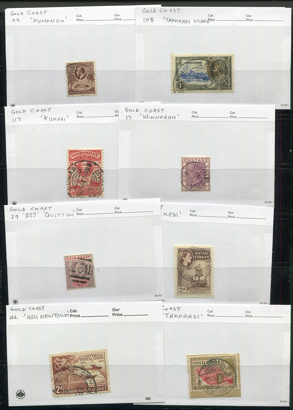 An enticing and seldom offered selection of 58 postmarks on stamp / stamp and piece, from the Queen Victoria to early QEII period, all neatly arranged / identified on "102" cards and placed on Vario stockpages. Some striking postmarks here, including both town and numeral types. Estimate =