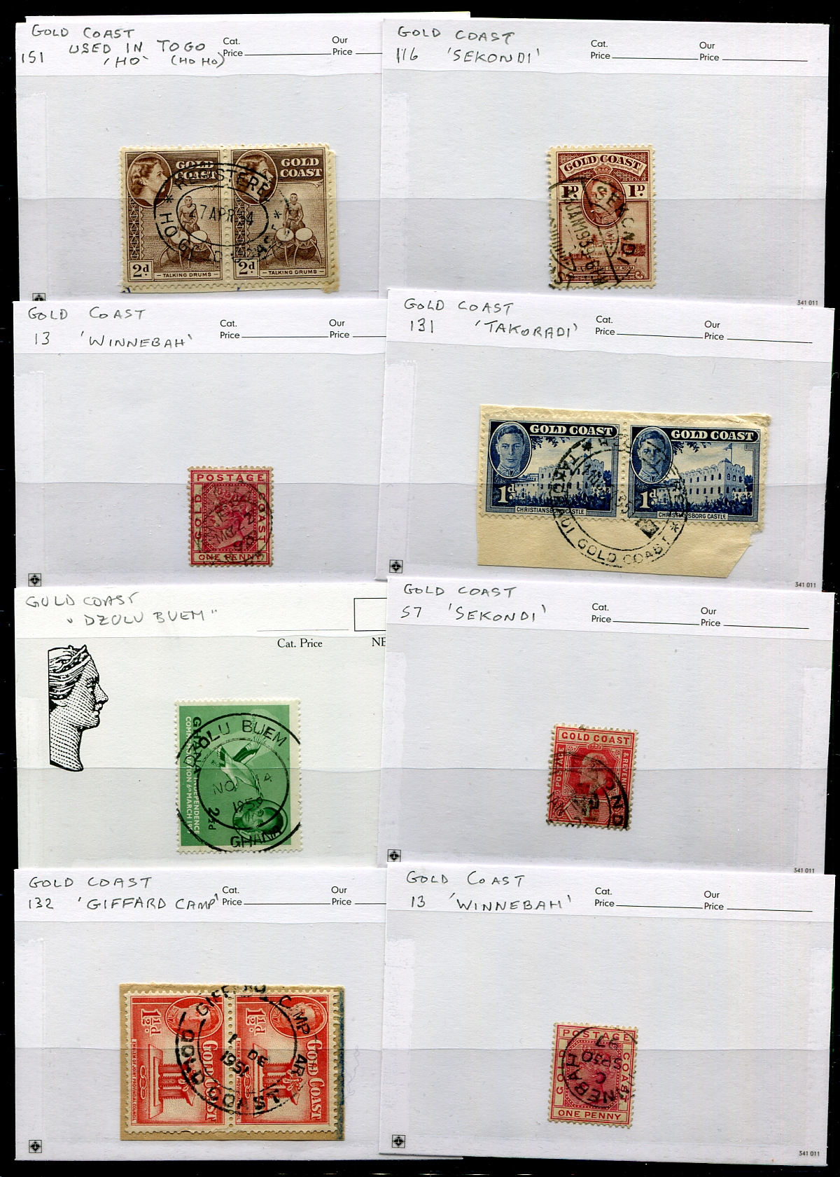 An enticing and seldom offered selection of 58 postmarks on stamp / stamp and piece, from the Queen Victoria to early QEII period, all neatly arranged / identified on "102" cards and placed on Vario stockpages. Some striking postmarks here, including both town and numeral types. Estimate =
