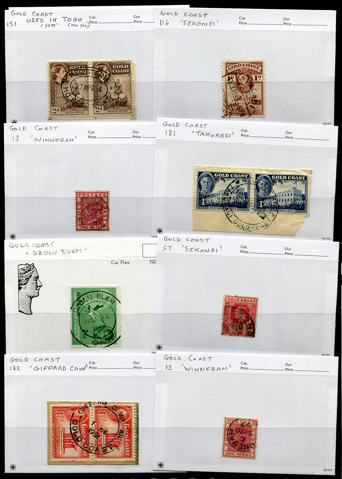 An enticing and seldom offered selection of 58 postmarks on stamp / stamp and piece, from the Queen Victoria to early QEII period, all neatly arranged / identified on "102" cards and placed on Vario stockpages. Some striking postmarks here, including both town and numeral types. Estimate =