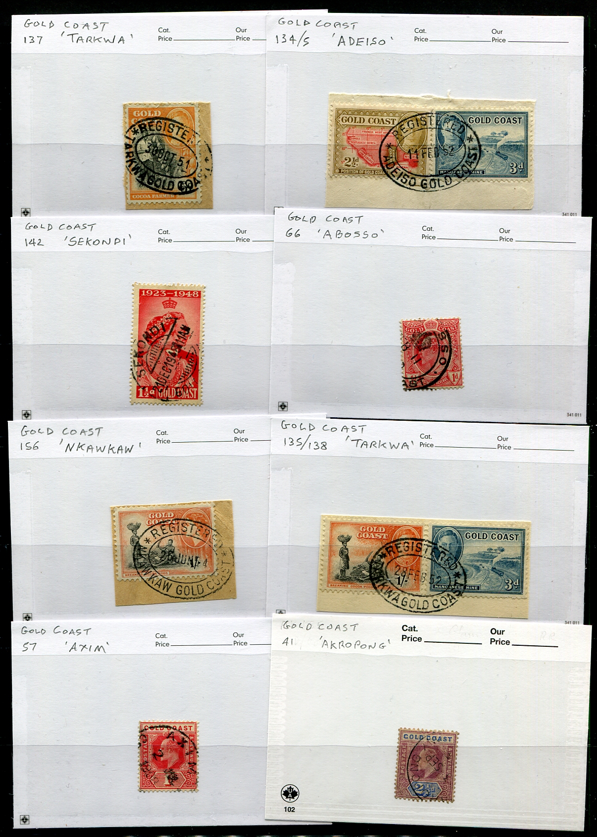 An enticing and seldom offered selection of 58 postmarks on stamp / stamp and piece, from the Queen Victoria to early QEII period, all neatly arranged / identified on "102" cards and placed on Vario stockpages. Some striking postmarks here, including both town and numeral types. Estimate =
