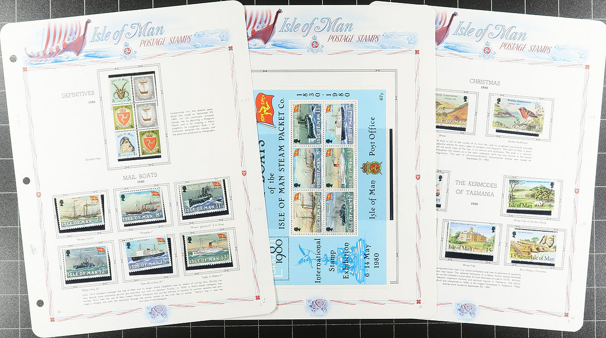 Collection of primarily never hinged Isle of Man, 1958-1987, containing roughly 750 stamps in hingeless White Ace album pages or stock pages, in a binder with slipcase. The collection ranges from Scott #1/339, containing several sets (2 each in some cases), a few souvenir sheets, along with a bit of used on some pages. A nice collection that should be continued until completion. Owner's 2026 Scott US$401.00 =