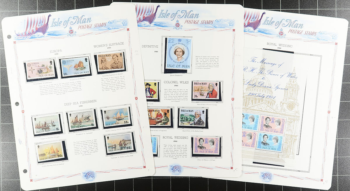 Collection of primarily never hinged Isle of Man, 1958-1987, containing roughly 750 stamps in hingeless White Ace album pages or stock pages, in a binder with slipcase. The collection ranges from Scott #1/339, containing several sets (2 each in some cases), a few souvenir sheets, along with a bit of used on some pages. A nice collection that should be continued until completion. Owner's 2026 Scott US$401.00 =