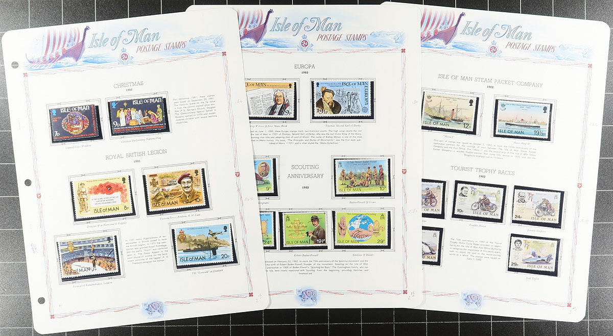 Collection of primarily never hinged Isle of Man, 1958-1987, containing roughly 750 stamps in hingeless White Ace album pages or stock pages, in a binder with slipcase. The collection ranges from Scott #1/339, containing several sets (2 each in some cases), a few souvenir sheets, along with a bit of used on some pages. A nice collection that should be continued until completion. Owner's 2026 Scott US$401.00 =