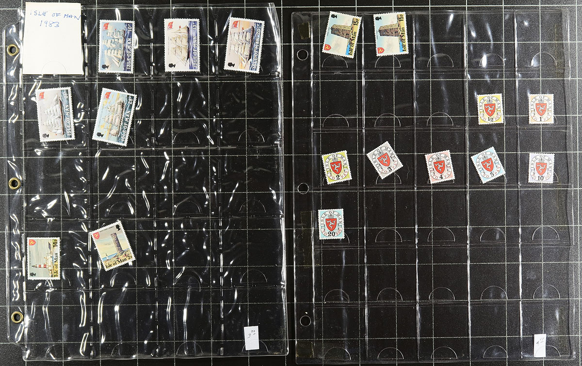 Collection of primarily never hinged Isle of Man, 1958-1987, containing roughly 750 stamps in hingeless White Ace album pages or stock pages, in a binder with slipcase. The collection ranges from Scott #1/339, containing several sets (2 each in some cases), a few souvenir sheets, along with a bit of used on some pages. A nice collection that should be continued until completion. Owner's 2026 Scott US$401.00 =