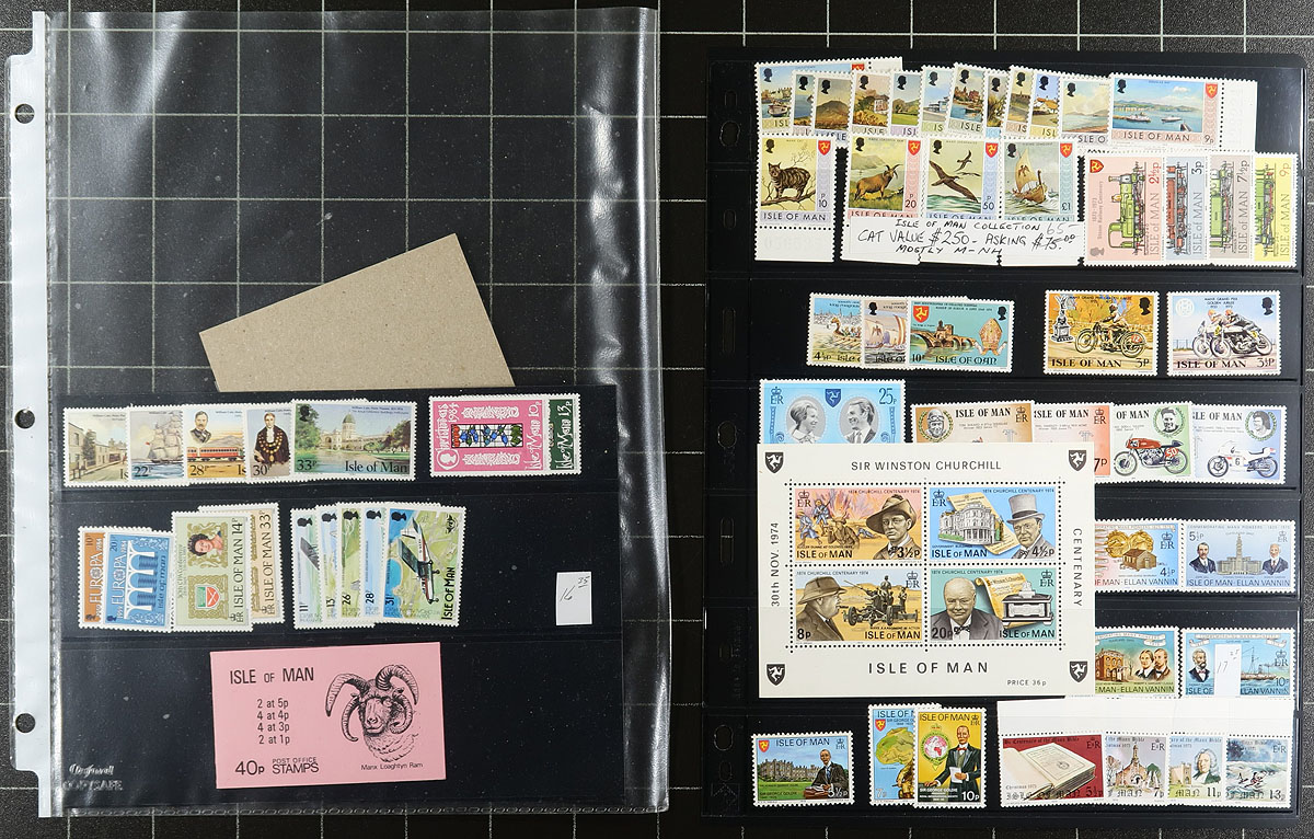 Collection of primarily never hinged Isle of Man, 1958-1987, containing roughly 750 stamps in hingeless White Ace album pages or stock pages, in a binder with slipcase. The collection ranges from Scott #1/339, containing several sets (2 each in some cases), a few souvenir sheets, along with a bit of used on some pages. A nice collection that should be continued until completion. Owner's 2026 Scott US$401.00 =