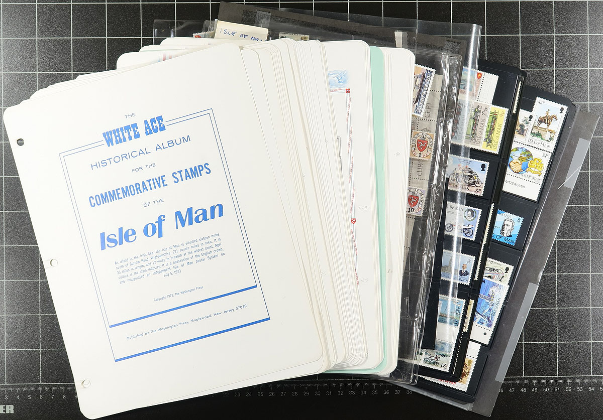 Collection of primarily never hinged Isle of Man, 1958-1987, containing roughly 750 stamps in hingeless White Ace album pages or stock pages, in a binder with slipcase. The collection ranges from Scott #1/339, containing several sets (2 each in some cases), a few souvenir sheets, along with a bit of used on some pages. A nice collection that should be continued until completion. Owner's 2026 Scott US$401.00 =