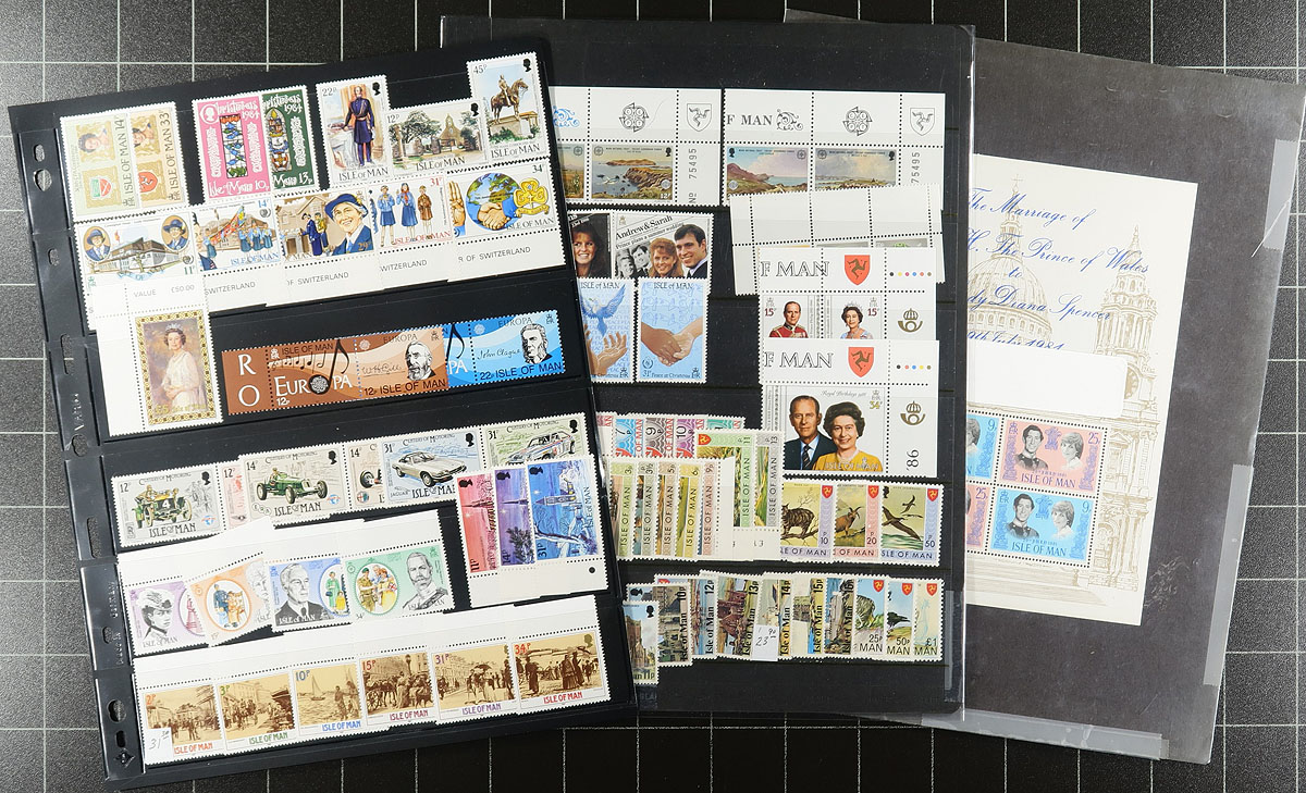 Collection of primarily never hinged Isle of Man, 1958-1987, containing roughly 750 stamps in hingeless White Ace album pages or stock pages, in a binder with slipcase. The collection ranges from Scott #1/339, containing several sets (2 each in some cases), a few souvenir sheets, along with a bit of used on some pages. A nice collection that should be continued until completion. Owner's 2026 Scott US$401.00 =